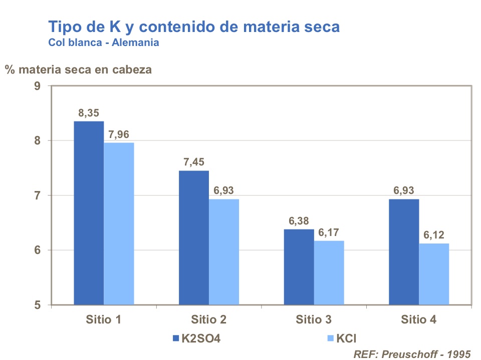 Azufre juega un papel importante en la calidad de las brassicas. Aplicando azufre en forma de sulfato de potasio incrementa el contenido de materia seca en col blanca, dando mejores propiedades de almacenaje.