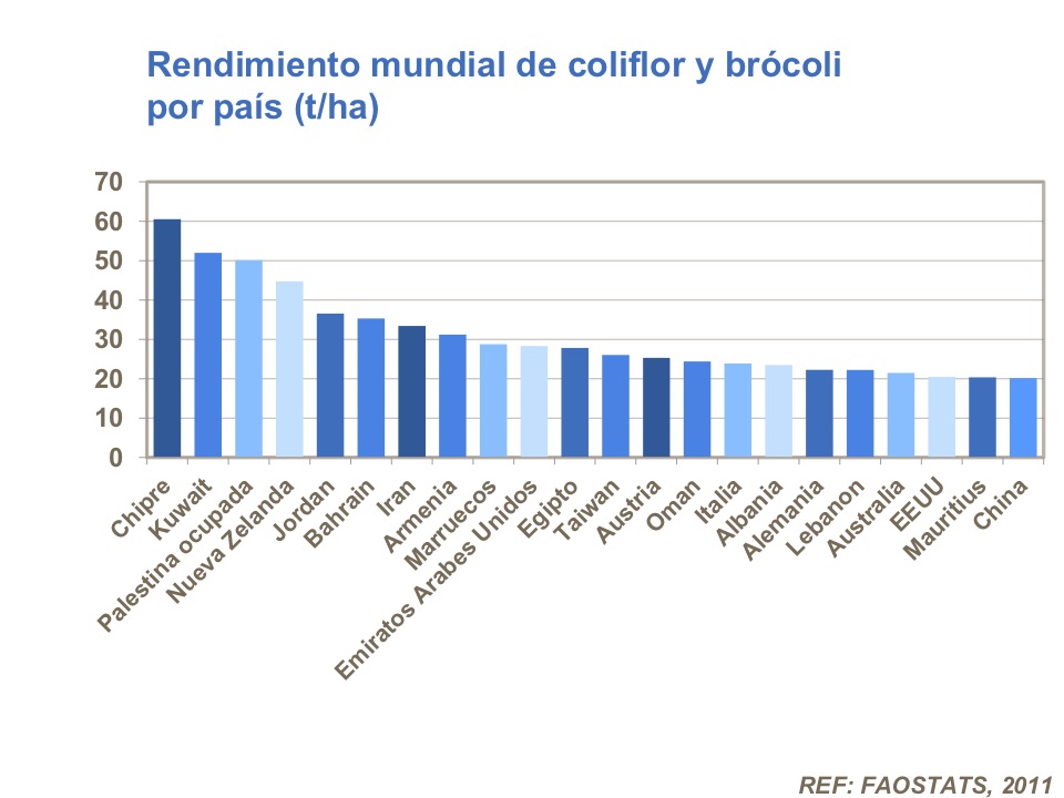 Se producen 20 millones de toneladas de brócoli y coliflor en el mundo, sobre una superficie de 1.6 millones de hectáreas. China y la India son los principales productores con 8.9 y 6.7 millones de toneladas por año, respectivamente, y representa 74% de la producción mundial. Les siguen España, México, Italia, Francia, EEUU, Polonia, Paquistán y Egipto, todos produciendo más de 0.2 millones toneladas/año.